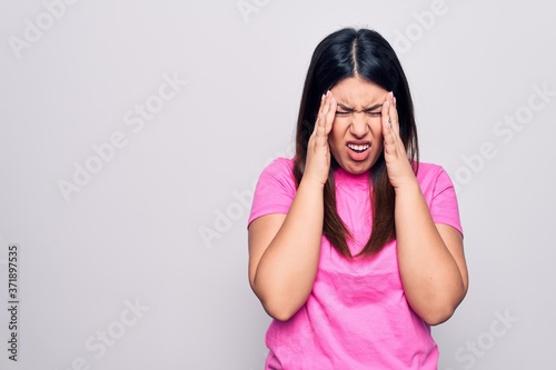 Young beautiful brunette woman wearing casual pink t-shirt standing over white background with hand on headache because stress. Suffering migraine.