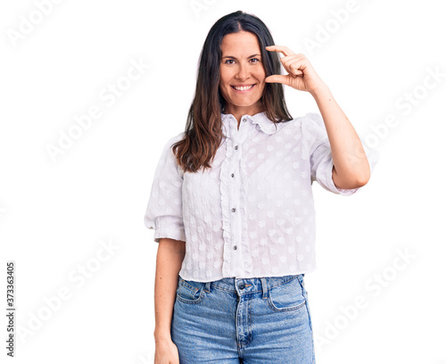 Young beautiful brunette woman wearing casual shirt smiling and confident gesturing with hand doing small size sign with fingers looking and the camera. measure concept.
