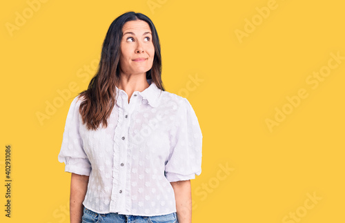 Young beautiful brunette woman wearing casual shirt smiling looking to the side and staring away thinking.