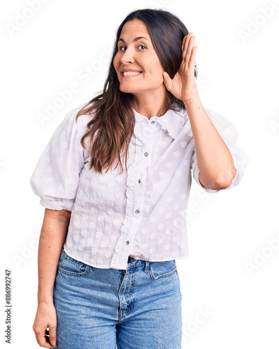 Young beautiful brunette woman wearing casual shirt smiling with hand over ear listening an hearing to rumor or gossip. deafness concept.