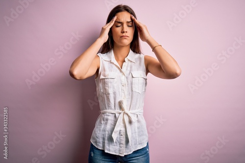 Young beautiful brunette woman wearing casual shirt standing over pink background suffering from headache desperate and stressed because pain and migraine. Hands on head.