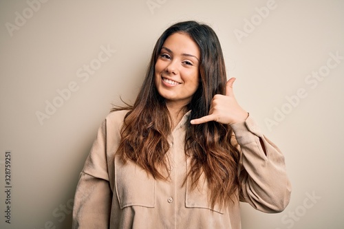 Young beautiful brunette woman wearing casual shirt standing over white background smiling doing phone gesture with hand and fingers like talking on the telephone. Communicating concepts.
