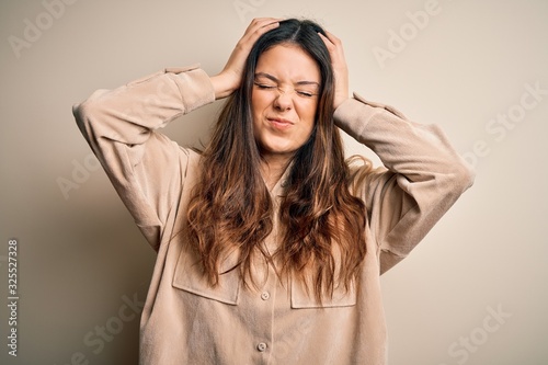 Young beautiful brunette woman wearing casual shirt standing over white background suffering from headache desperate and stressed because pain and migraine. Hands on head.