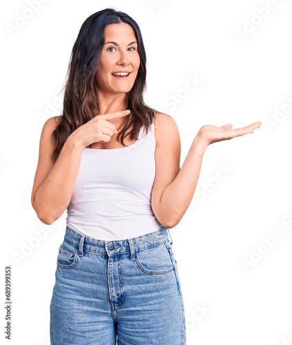 Young beautiful brunette woman wearing casual sleeveless t-shirt amazed and smiling to the camera while presenting with hand and pointing with finger.