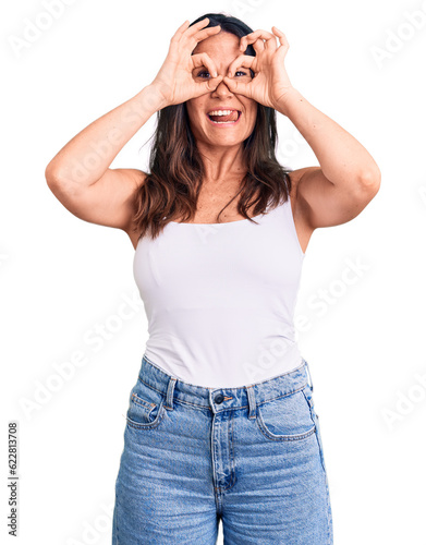 Young beautiful brunette woman wearing casual sleeveless t-shirt doing ok gesture like binoculars sticking tongue out, eyes looking through fingers. crazy expression.
