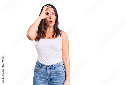 Young beautiful brunette woman wearing casual sleeveless t-shirt doing ok gesture shocked with surprised face, eye looking through fingers. unbelieving expression.