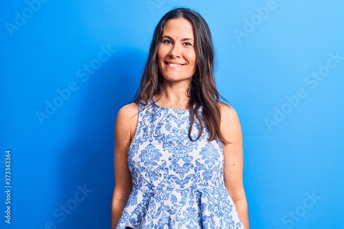 Young beautiful brunette woman wearing casual sleeveless t-shirt over blue background with a happy and cool smile on face. Lucky person.