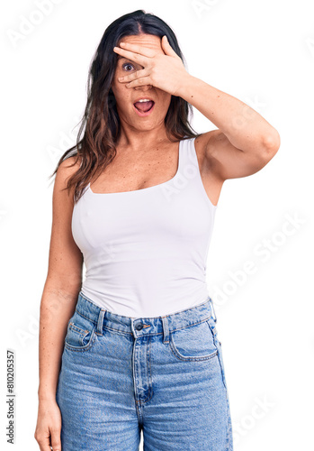 Young beautiful brunette woman wearing casual sleeveless t-shirt peeking in shock covering face and eyes with hand, looking through fingers with embarrassed expression.
