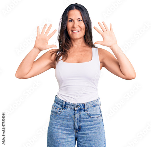 Young beautiful brunette woman wearing casual sleeveless t-shirt showing and pointing up with fingers number ten while smiling confident and happy.