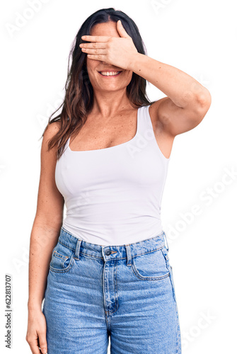 Young beautiful brunette woman wearing casual sleeveless t-shirt smiling and laughing with hand on face covering eyes for surprise. blind concept.