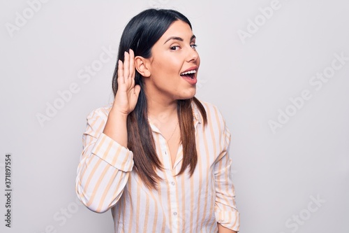 Young beautiful brunette woman wearing casual striped shirt standing over white background smiling with hand over ear listening and hearing to rumor or gossip. Deafness concept.