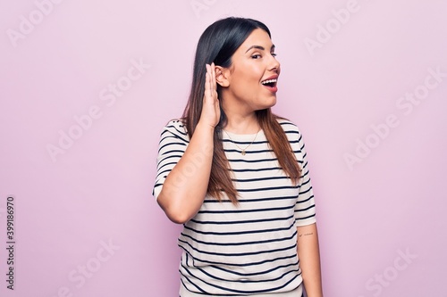 Young beautiful brunette woman wearing casual striped t-shirt over isolated pink background smiling with hand over ear listening and hearing to rumor or gossip. Deafness concept.