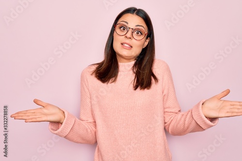 Young beautiful brunette woman wearing casual sweater and glasses over pink background clueless and confused expression with arms and hands raised. Doubt concept.