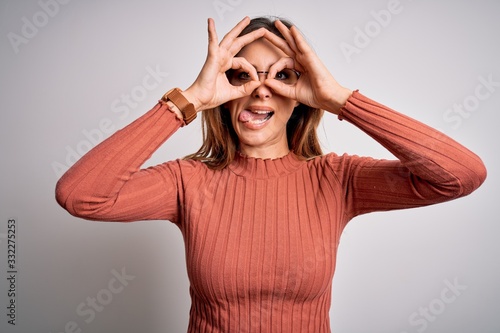 Young beautiful brunette woman wearing casual sweater and glasses over white background doing ok gesture like binoculars sticking tongue out, eyes looking through fingers. Crazy expression.