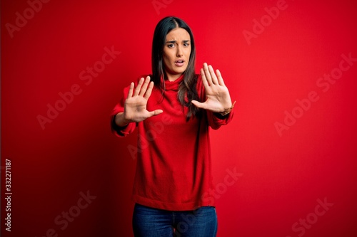 Young beautiful brunette woman wearing casual sweater over isolated red background doing stop gesture with hands palms, angry and frustration expression