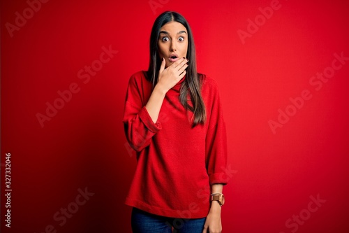 Young beautiful brunette woman wearing casual sweater over isolated red background Looking fascinated with disbelief, surprise and amazed expression with hands on chin