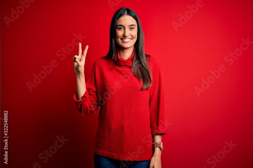 Young beautiful brunette woman wearing casual sweater over isolated red background showing and pointing up with fingers number two while smiling confident and happy.