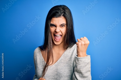 Young beautiful brunette woman wearing casual sweater standing over blue background angry and mad raising fist frustrated and furious while shouting with anger. Rage and aggressive concept.