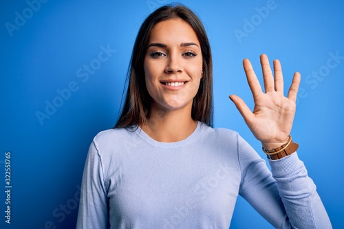 Young beautiful brunette woman wearing casual sweater standing over blue background showing and pointing up with fingers number five while smiling confident and happy.