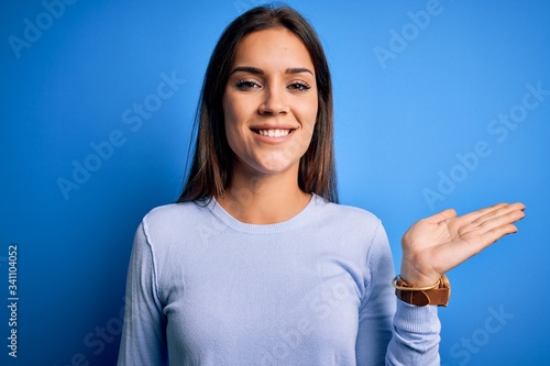 Young beautiful brunette woman wearing casual sweater standing over blue background smiling cheerful presenting and pointing with palm of hand looking at the camera.