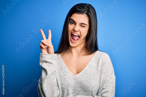 Young beautiful brunette woman wearing casual sweater standing over blue background smiling with happy face winking at the camera doing victory sign. Number two.