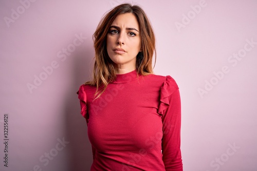 Young beautiful brunette woman wearing casual sweater stnding over pink background with serious expression on face. Simple and natural looking at the camera.