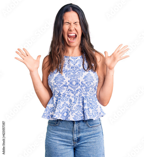 Young beautiful brunette woman wearing casual t-shirt celebrating mad and crazy for success with arms raised and closed eyes screaming excited. winner concept