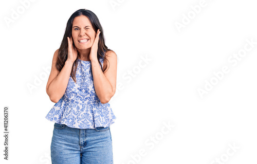 Young beautiful brunette woman wearing casual t-shirt covering ears with fingers with annoyed expression for the noise of loud music. deaf concept.