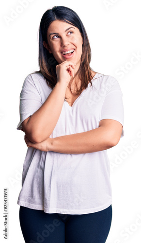 Young beautiful brunette woman wearing casual t-shirt looking confident at the camera with smile with crossed arms and hand raised on chin. thinking positive.