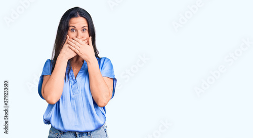 Young beautiful brunette woman wearing casual t-shirt shocked covering mouth with hands for mistake. secret concept.