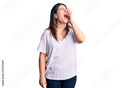 Young beautiful brunette woman wearing casual t-shirt shouting and screaming loud to side with hand on mouth. communication concept.