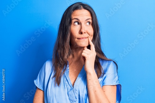 Young beautiful brunette woman wearing casual t-shirt standing over isolated blue background thinking concentrated about doubt with finger on chin and looking up wondering