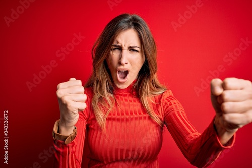 Young beautiful brunette woman wearing casual turtleneck sweater over red background angry and mad raising fists frustrated and furious while shouting with anger. Rage and aggressive concept.