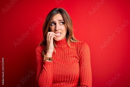 Young beautiful brunette woman wearing casual turtleneck sweater over red background looking stressed and nervous with hands on mouth biting nails. Anxiety problem.