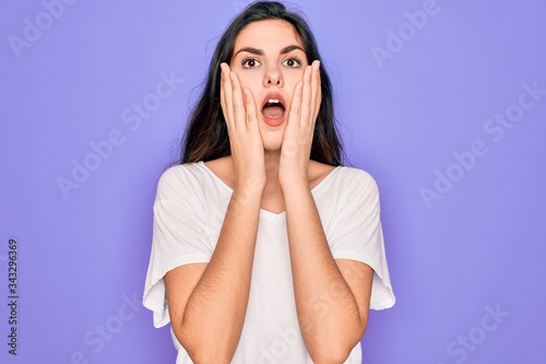 Young beautiful brunette woman wearing casual white t-shirt over purple background afraid and shocked, surprise and amazed expression with hands on face