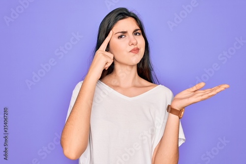 Young beautiful brunette woman wearing casual white t-shirt over purple background confused and annoyed with open palm showing copy space and pointing finger to forehead. Think about it.