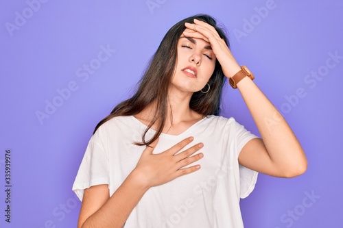 Young beautiful brunette woman wearing casual white t-shirt over purple background Touching forehead for illness and fever, flu and cold, virus sick