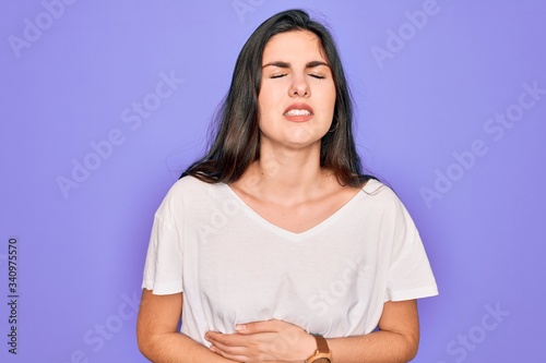 Young beautiful brunette woman wearing casual white t-shirt over purple background with hand on stomach because indigestion, painful illness feeling unwell. Ache concept.