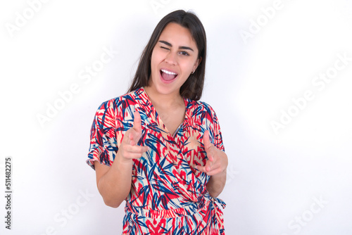 young beautiful brunette woman wearing colourful dress over white wall directs fingers at camera selects someone. I recommend you. Best choice