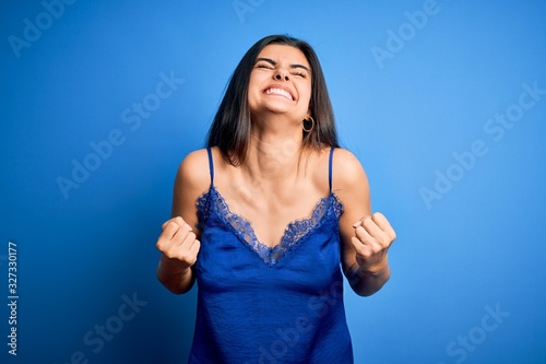 Young beautiful brunette woman wearing elegant and comfortable blue lingerie underwear very happy and excited doing winner gesture with arms raised, smiling and screaming for success. Celebration