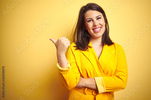 Young beautiful brunette woman wearing elegant dress over yellow isolated background smiling with happy face looking and pointing to the side with thumb up.