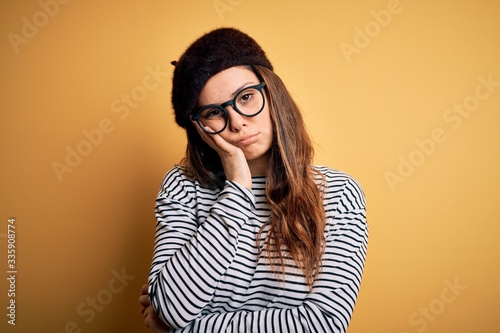 Young beautiful brunette woman wearing french beret and glasses over yellow background thinking looking tired and bored with depression problems with crossed arms.