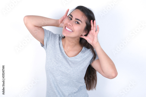 young beautiful brunette woman wearing grey t-shirt over white wall Trying to hear both hands on ear gesture, curious for gossip. Hearing problem, deaf
