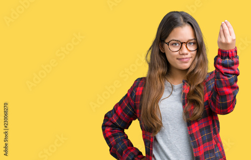 Young beautiful brunette woman wearing jacket and glasses over isolated background Doing Italian gesture with hand and fingers confident expression