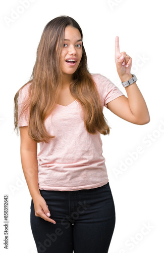 Young beautiful brunette woman wearing pink t-shirt over isolated background pointing finger up with successful idea. Exited and happy. Number one.