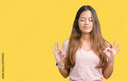 Young beautiful brunette woman wearing pink t-shirt over isolated background relax and smiling with eyes closed doing meditation gesture with fingers. Yoga concept.