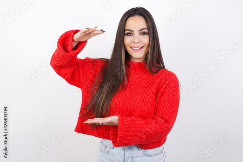 young beautiful brunette woman wearing red knitted sweater over white wall gesturing with hands showing big and large size sign, measure symbol.