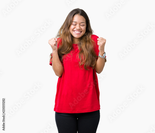 Young beautiful brunette woman wearing red t-shirt over isolated background excited for success with arms raised celebrating victory smiling. Winner concept.
