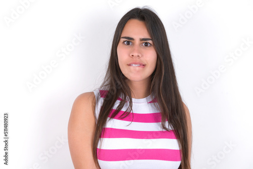 young beautiful brunette woman wearing striped top over white wall being nervous and scared biting lips looking camera with impatient expression, pensive.