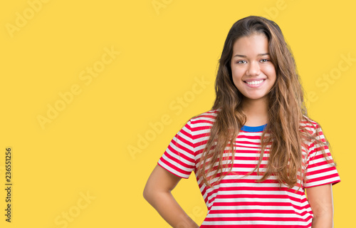 Young beautiful brunette woman wearing stripes t-shirt over isolated background with a happy and cool smile on face. Lucky person.